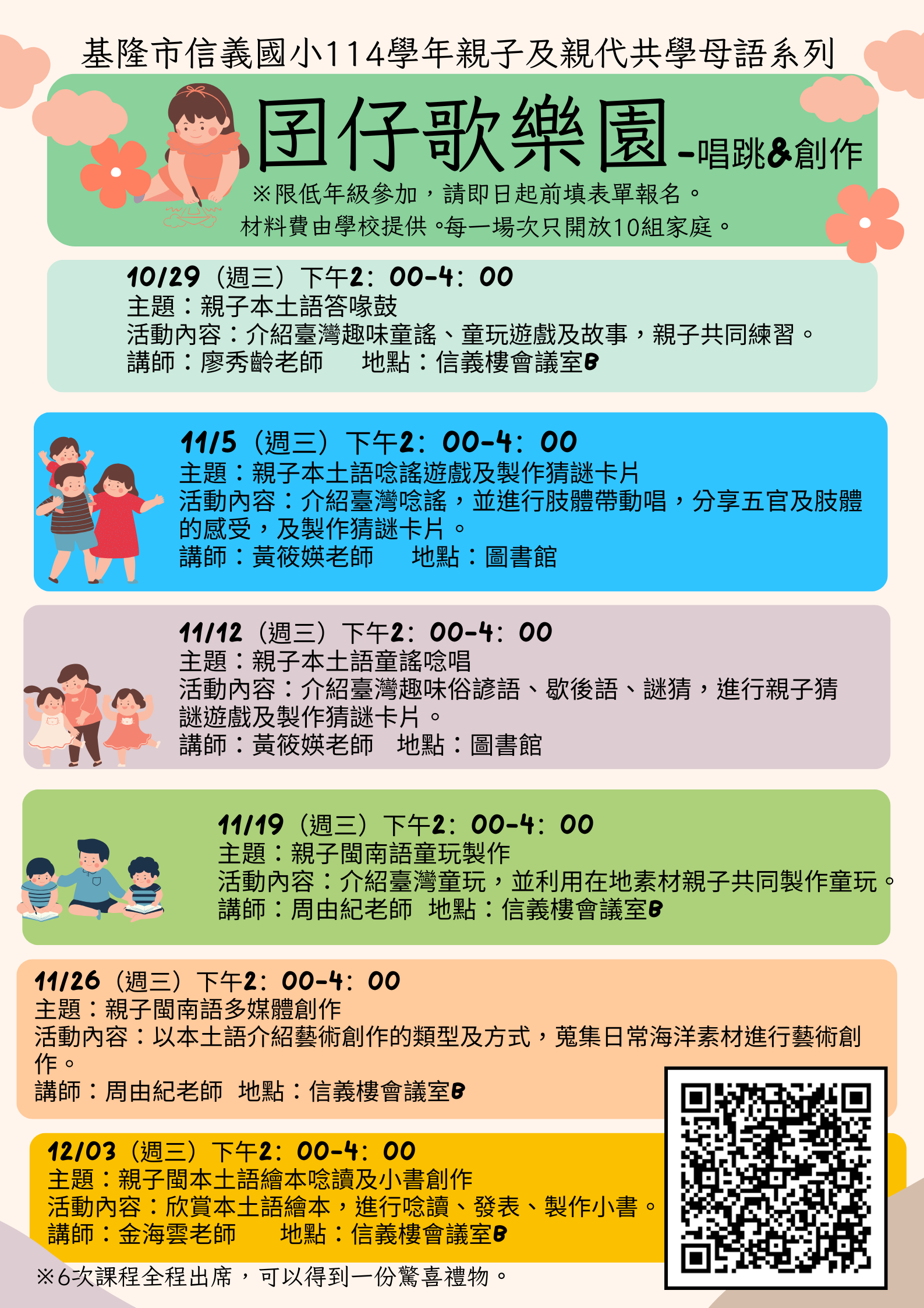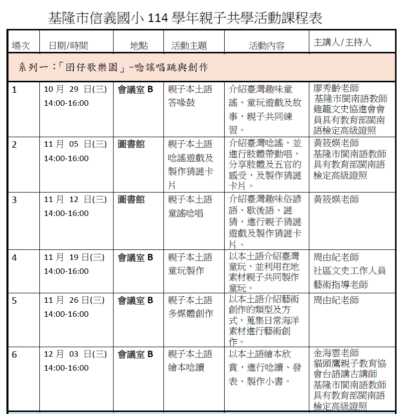信義國小辦理114年度教育部親子共學母語課程系列-囡仔歌樂園,歡迎親子報名參加。