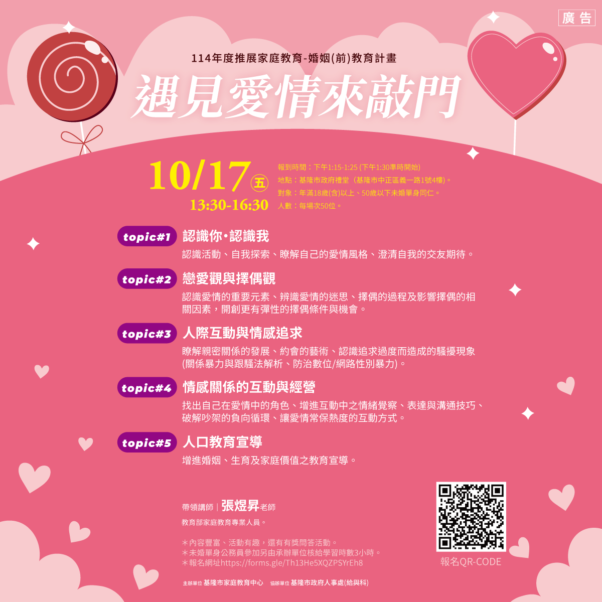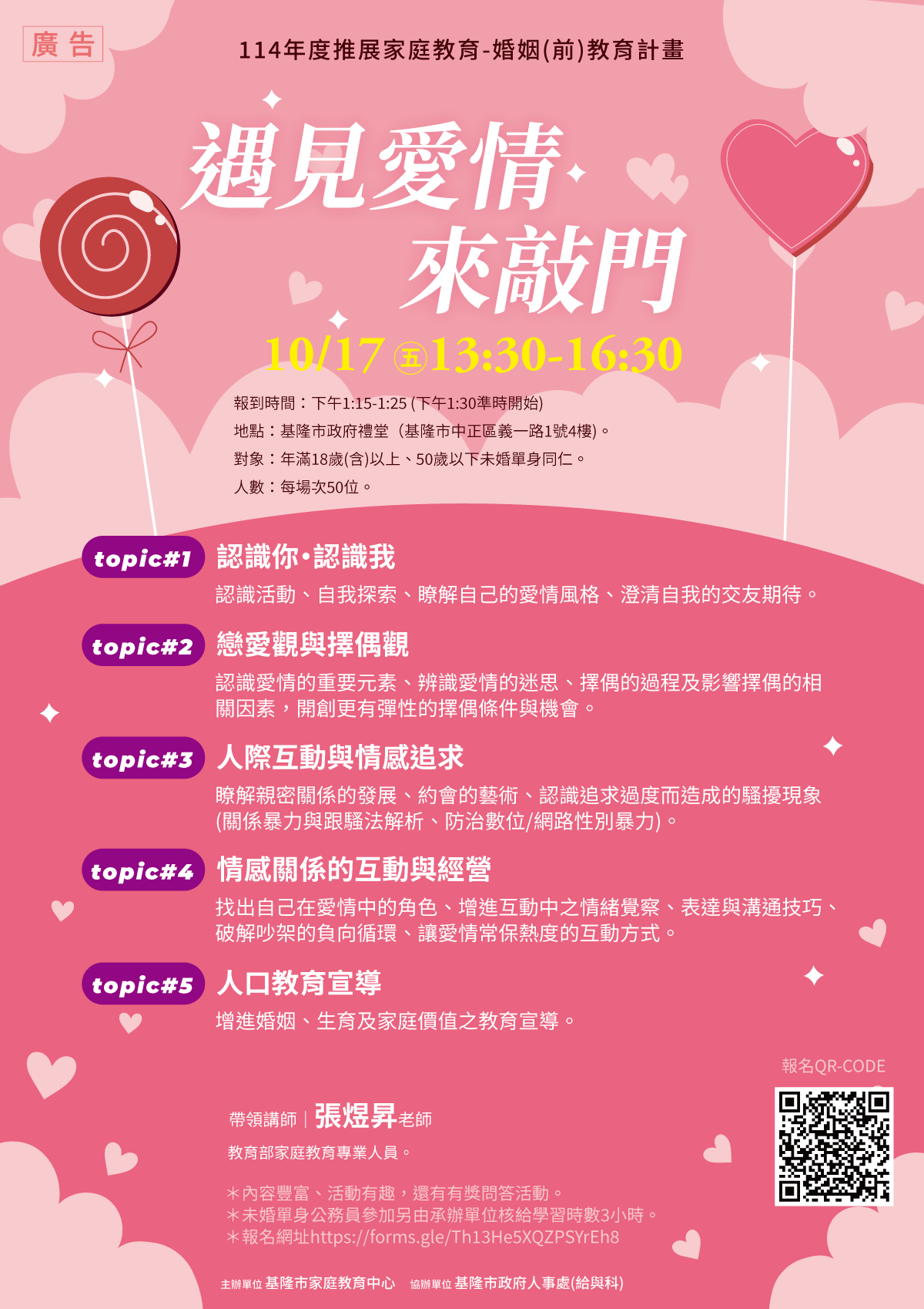- 報名網址 https://forms.gle/Th13He5XQZPSYrEh8 或掃描文宣QR-Code報名,如有相關問題可聯繫基隆市家庭教育中心(02)2427-1724盧小姐。