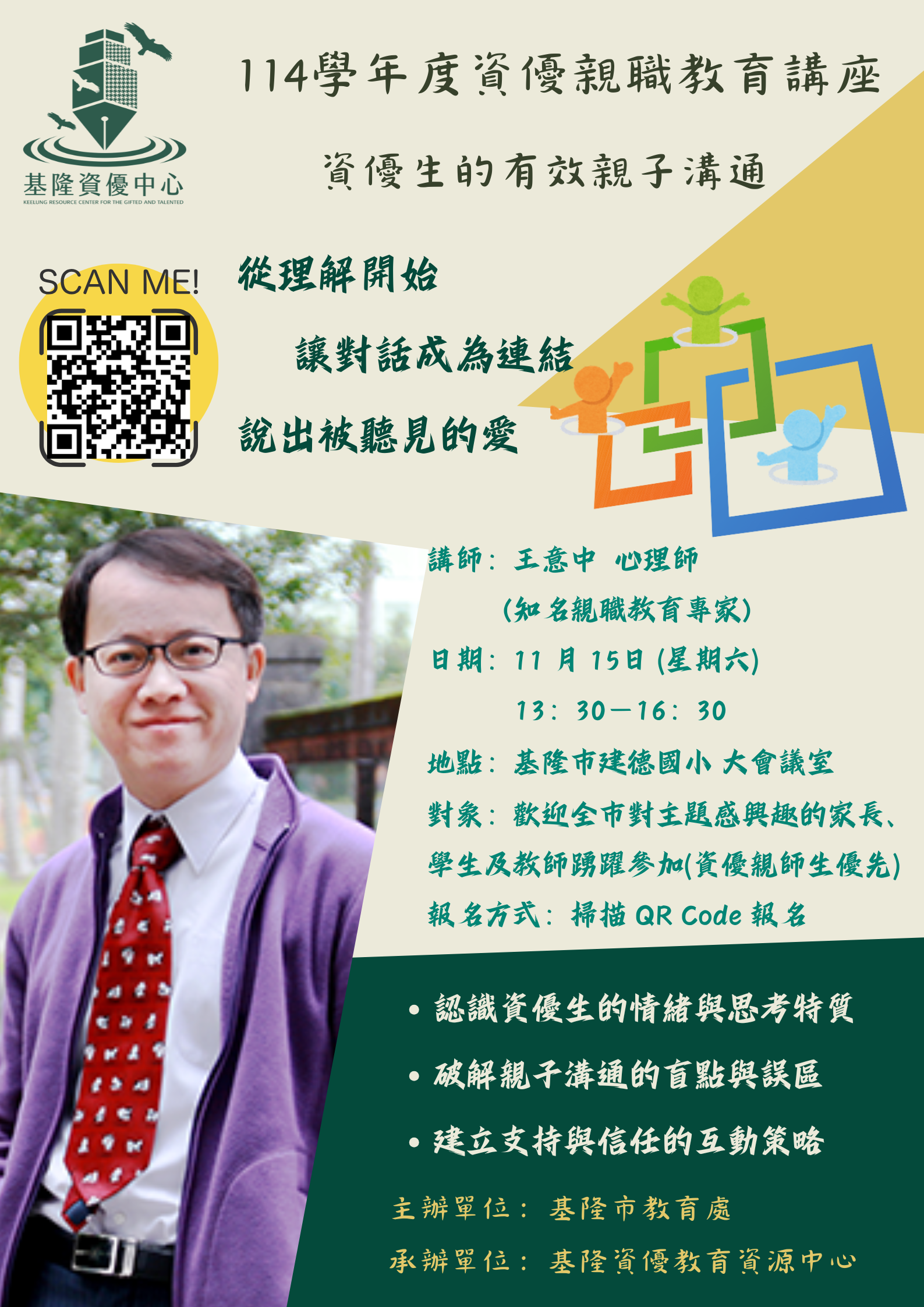 | 公告主旨 | 轉知基隆市資優教育中心辦理親職教育講座「資優生的有效親子溝通」,詳見附件。 |